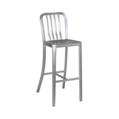 Anna Barstool, outdoor/indoor, slat back, saddle seat, brushed aluminum with clear lacquer coat, foot rest, PVC foot caps.