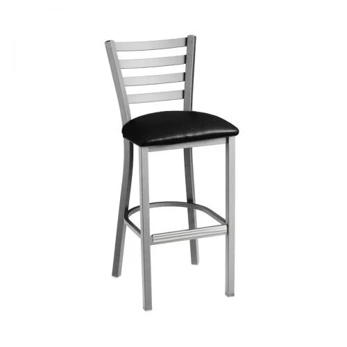 Standard powder coat barstool with non-marring butyrate glides, 1 inch pullover style seat, and choice of gold, black, or silver footrest.